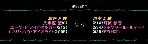 弓矢でどれくらいクリティカルが出るか確認しようと思い組みましたが、 通常戦で急遽、槍を装備することにしたため槍装備に。 全体攻撃を使われるとどうしても後衛を守ることが出来ません…。 まぁそれ以前に私の耐久力がないので、狙われてもすぐ落ちてしまいますが; 通常戦も似たようで、サンダーバードが後衛も攻撃してきました。 ビッグライトニングはとても怖いです…紗雪は避けましたがw 熟練度は異種共有を覚えるために格闘20にして、槍も出来るだけ挙げました。 >闘技大会6回戦6試合目 完敗でした\(^o^)/ 相手に夢幻の造られしものがいる怖ろしい相手…非接触で狙いましたが、 反射剥しのスリープが1発しか当たらずトドメのトリスタンアローが自分にorz あとはもうただやられっぱなしで即行で終わりました。 数パターンあるこちらの戦法のどれもが通用しそうにないPTにもう涙目でした。 6勝目は7試合目で頑張りましょうか♪ という第一発声をPBBSでしてましたが、 さーて、最終試合で6勝目を勝ち取りましょうか♪ …どうやら今回で運は尽きたようです。 PR この記事にコメントする