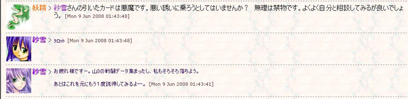 前回初参加だったときの失敗を教訓にして得た勝利…(ホロリ ずっと欲しかった表情アイコンを3つ作って貰うんだぁ(´∇`) と、こんな叫びから入ってしまいましたが44日目の雑感を。 ふむ、見慣れたデザインが急に変わると見難くく感じる…まるでmixiのよう。 最初の変更の時は区切りがサッパリでしたが、変更後はマシになったかな。 分かり易いけど見難い、そんな第一印象。でももうだいぶ慣れてきました。 異常撒きタイプではないけれど!!!!!マークが意外と気に入ってたことに気付く。 あと今回からの第二次修正ラッシュでどうなっていくのか…。 個人的には○撃や貫通などの威力・発動率の辺りが関係してるので、 使い物にならないほど弱くならなきゃいいけれど。 熟練度の調査と戦闘結果の感想は長くなったのでたたみます。 |